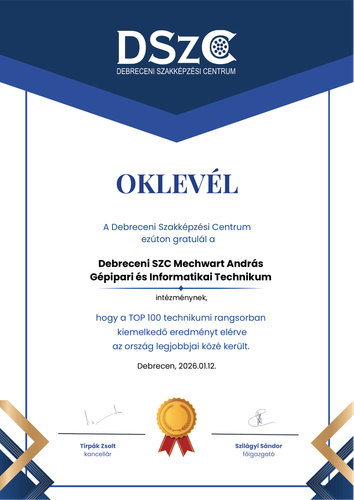 A mai napon vette át iskolánk igazgatója, Dr. Barcsa Lajos a Debreceni Szakképzési Centrum elismerő oklevelét.
